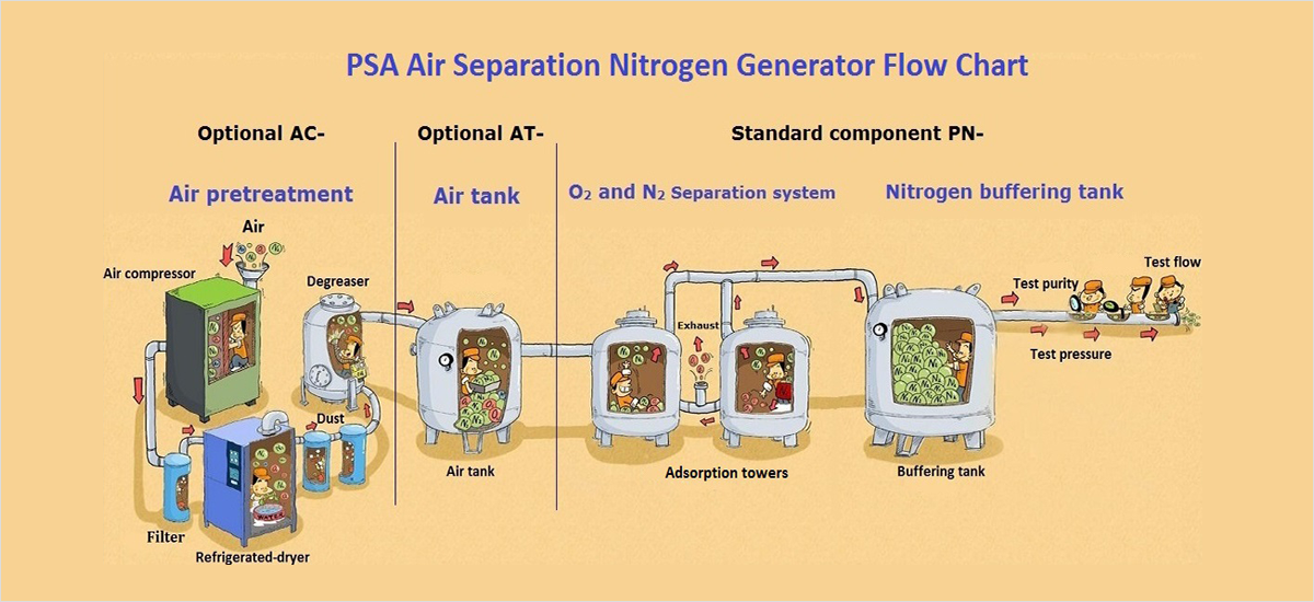 산소는 산소흡착제에 흡착되고 최종적으로 고순도의 질소만이 생산됩니다.
