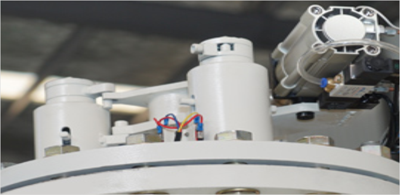 흡착탑 상부에 부착된 공압실린더는 흡착탑내 CMS를 항시 압축시킴으로써, 흡착제의 분말화 가능성을 원천 차단시키며 동시에 CMS의 효율/수명을 높입니다. 실린더에는 작동확인기능, CMS 손실 확인기능, CMS 보충 1차경보, 2차경보 및 분진 감지 시 기계 자동정지 기능이 탑재되어있습니다.