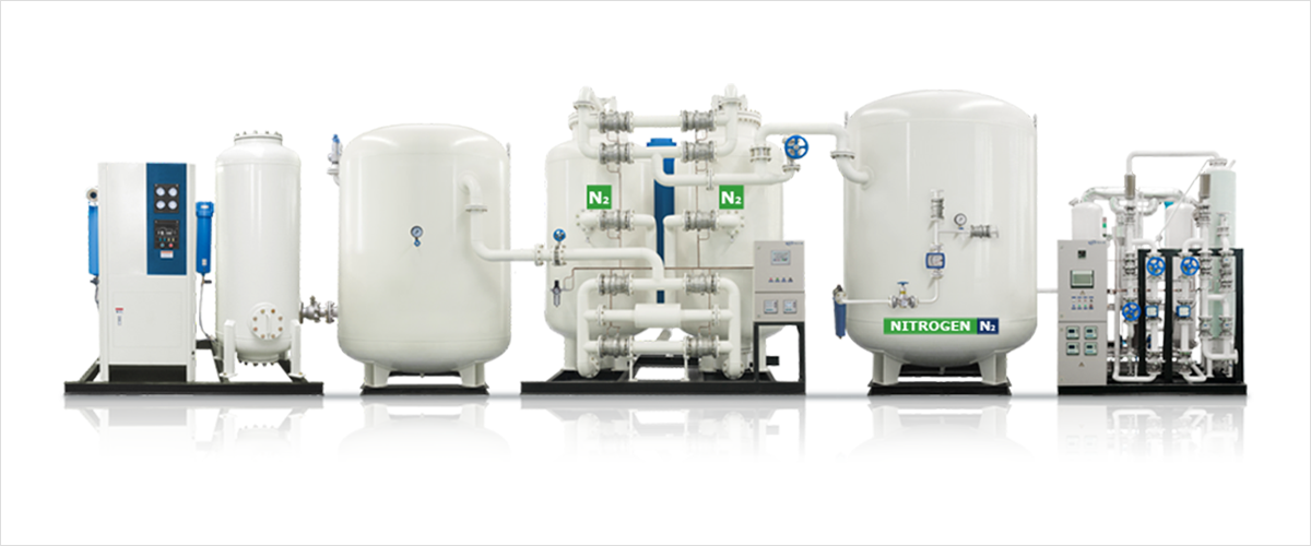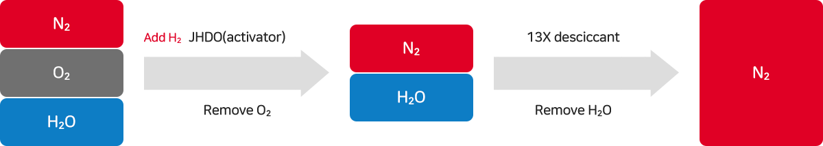 [PSA,질소발생기] + [Gas Purifier, 정제기] 로 구성됩니다. 일정 산소를 PSA기술로 1차 제거한 이후, 잔존하는 미세 산소를 수소를 투입하여 화학반응을 통해 2차 제거합니다. 이 두 공정을 거친 후 99.9999% 이상의 초고순도 질소가 생산됩니다. PSA기술만으로 초고순도 질소를 생산하는 것에 대비하여, 보다 적은 전기료로 초고순도의 질소를 생산할 수 있습니다.